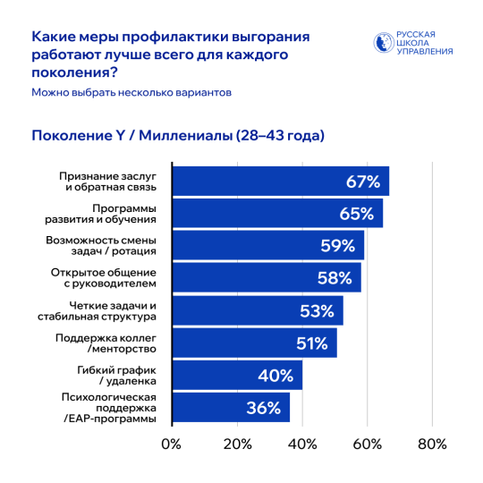 • Поколение Z: для них наиболее эффективны гибкий график и удаленка (75%), поддержка коллег и менторство (59%), программы развития и обучения (58%), психологическая поддержка / EAP-программы (57%), признание заслуг и обратная связь (52%), смена задач / ротация (48%), открытое общение с руководителем (46%) и четкая структура задач (32%).