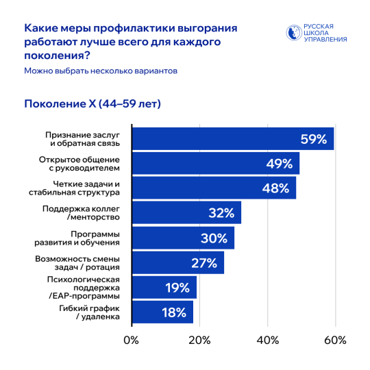 • Поколение X: главные меры — признание заслуг и обратная связь, открытое общение с руководителем, четкие задачи и стабильная структура, поддержка коллег, программы развития и обучения, ротация, психологическая поддержка и гибкий график.